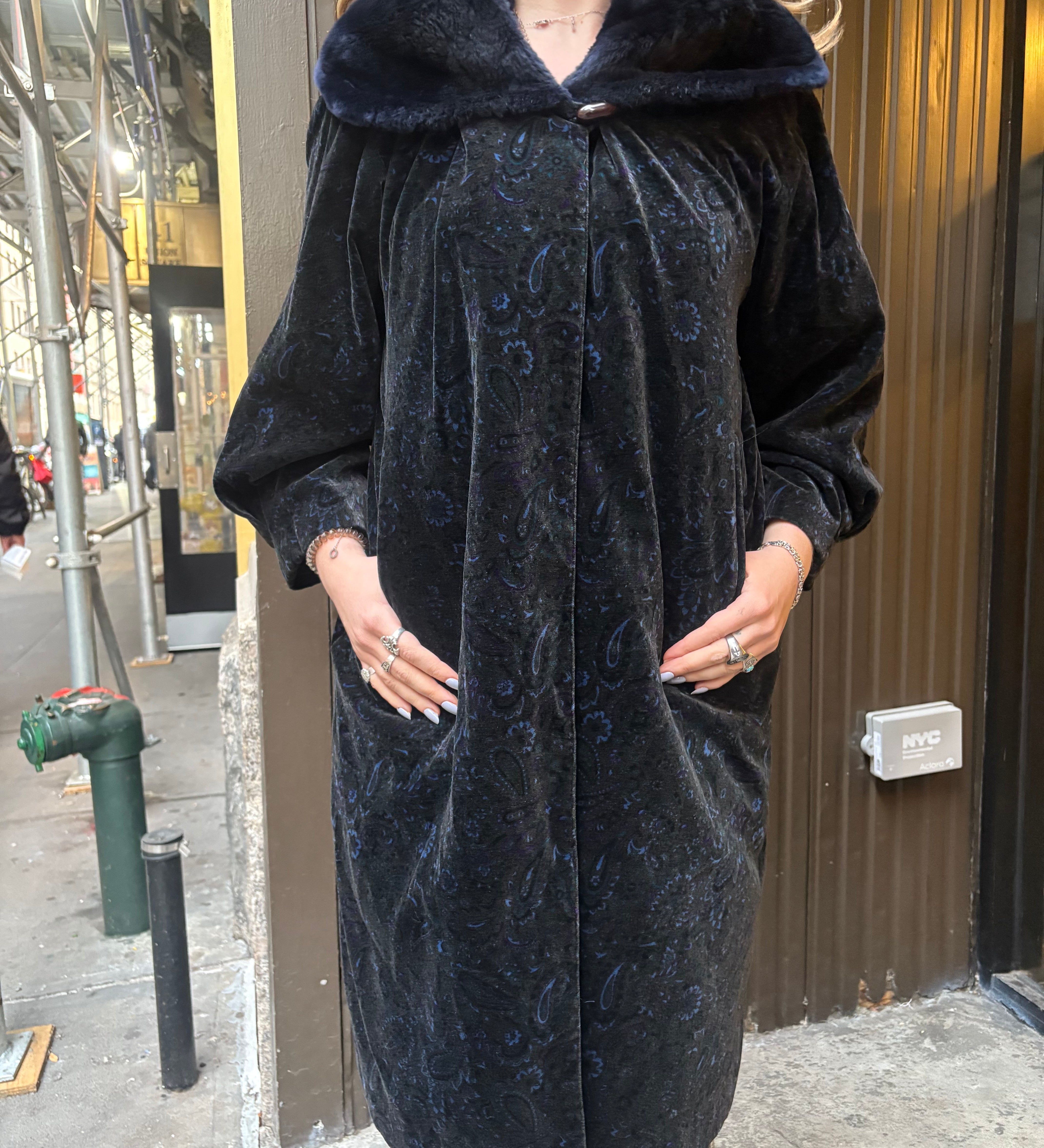 Emba Vintage Velvet Paisley Fur Lined Trench Coat